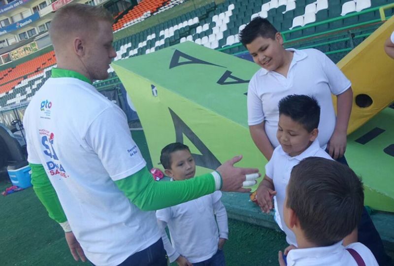 Jugadores de León sonríen con los niños