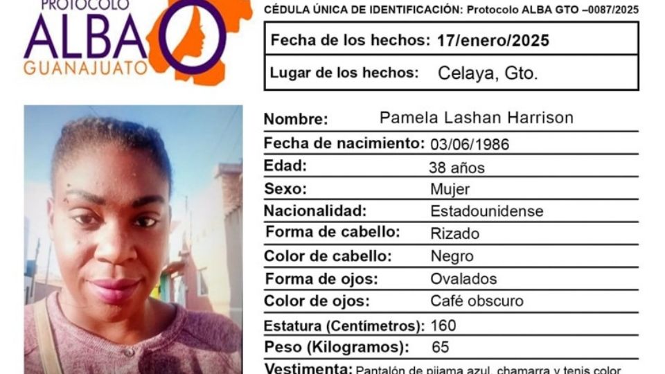 Celaya, Guanajuato.- Pamela Lashan Harrison, de nacionalidad estadounidense, desapareció el 17 de enero del 2025