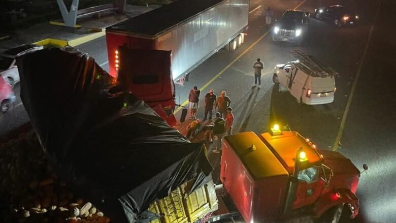 En la carretera quedaron los pesados camiones y el producto que transportaban, regado por la cinta asfáltica, lo que ocasionó que la circulación se cerrará por varios minutos.