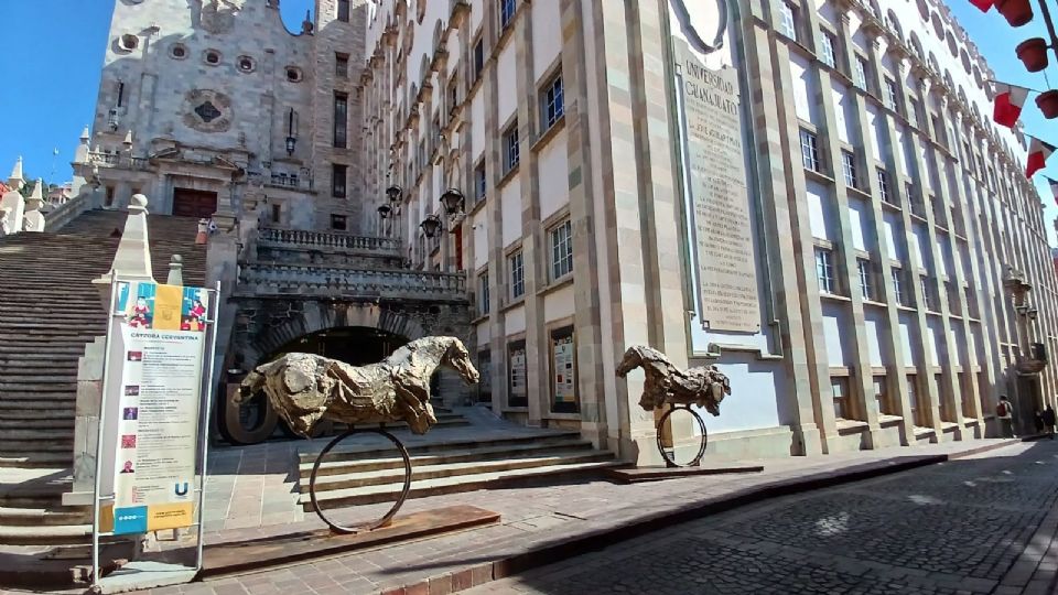 La Plaza de la Paz amaneció con la presencia de dos monumentales esculturas de toros, y al pie de las escalinatas de la Universidad de Guanajuato, dos majestuosos caballos elaborados a base de bronce, a manos del artista guanajuatense Javier de Jesús Hernández Capelo.