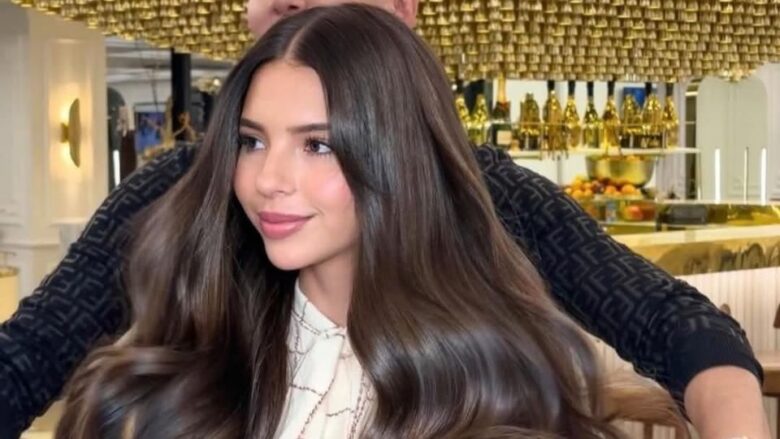 La larga cabellera de Angela Aguilar está valuada en más de 500 mil pesos, la cual pagó su esposo Christian Nodal, quien la acompañó al salón “Micky Hair”.