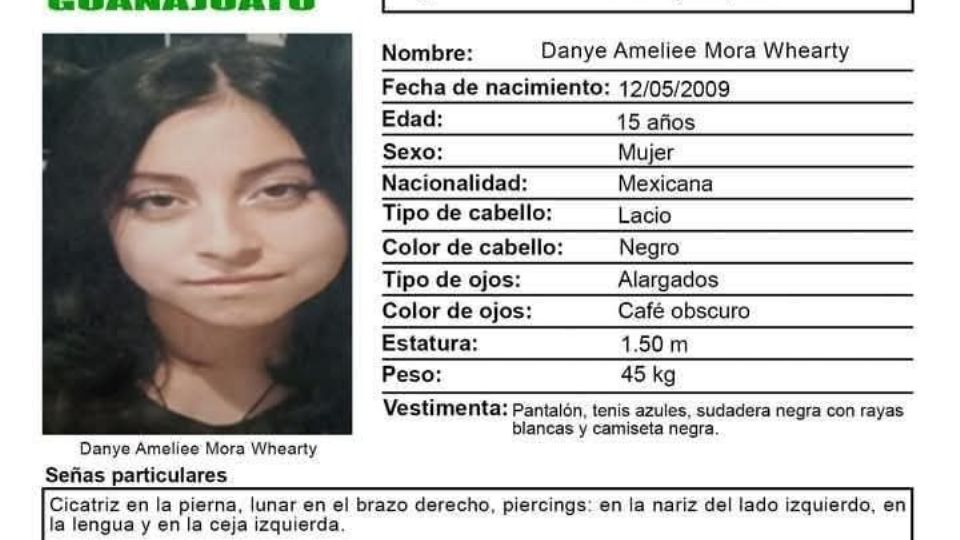Guanajuato, Guanajuato.- Familiares de Danye Ameliee Mora Whearty piden ayuda para dar con su paradero. La adolescente de 15 años fue vista por última ocasión el 14 de marzo por la preparatoria oficial y la Alameda, en el centro de la ciudad.