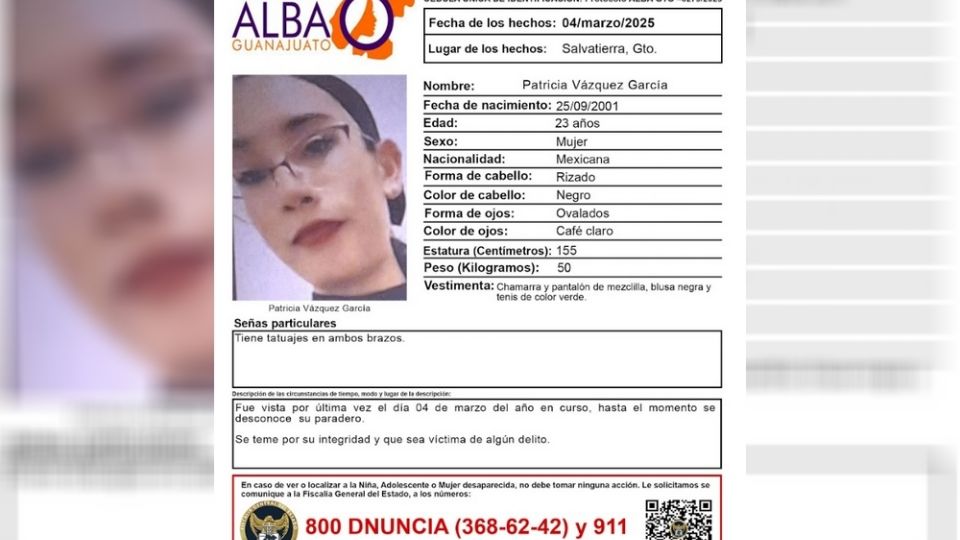 Salvatierra, Guanajuato.- Se activó el protocolo ALBA Guanajuato por la desaparición de Patricia Vázquez García, quien fue vista por última vez el 4 de marzo pasado en el municipio de Salvatierra.