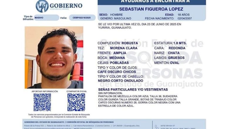 Sebastián Figueroa López es de complexión robusta, tez morena clara, ojos café oscuro, cabello negro, mide 1.8 metros; la última vez que lo vieron usaba pantalón de mezclilla azul, sudadera guinda, botas de trabajo café oscuro y una gorra negra con una estrella azul.