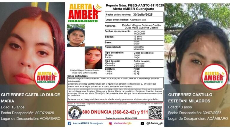 Acámbaro, Guanajuato.- Las hermanas Estefani Milagros y Dulce María Gutiérrez Castillo fueron reportadas como desaparecidas.