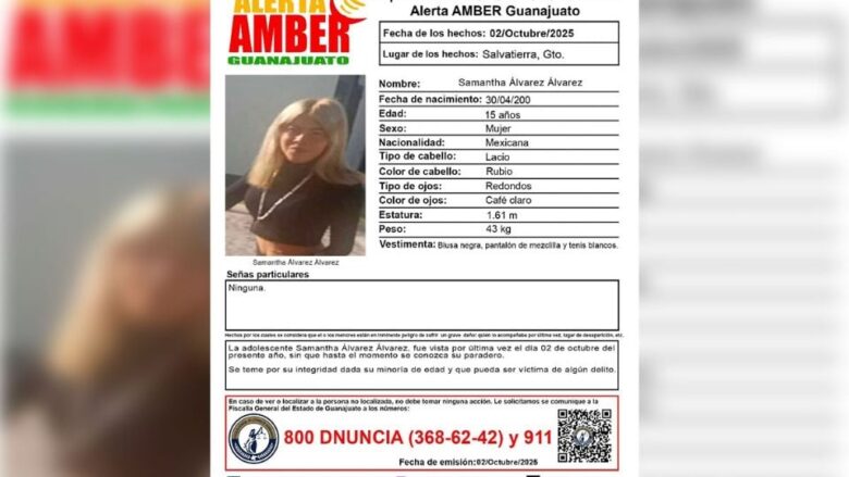 Familiares buscan a Samantha Álvarez Álvarez, adolescente desaparecida en Salvatierra, Guanajuato tras salir con amigas el 2 de octubre. Piden ayuda para localizarla. Foto: Cortesía Alerta Amber Guanajuato.