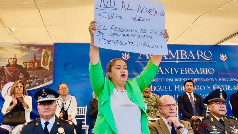 Acámbaro.- Durante la conmemoración del 215 aniversario de la constitución del Ejército Insurgente y la proclamación de Miguel Hidalgo como Generalísimo de América, la alcaldesa panista de Acámbaro, Claudia Silva Campos, tomó la pancarta de un ciudadano para manifestar su rechazo al acueducto Solís-León.