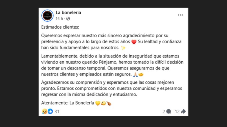 La Bonelería agradeció la comprensión y esperan que las cosas mejoren pronto en materia de seguridad en Pénjamo.