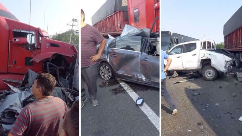 Al llegar encontraron que un tráiler rojo había impactado por alcance una camioneta blanca tipo pick up, además chocó también y auto tipo sedán gris, este prensó contra la parte trasera de un camión de transporte de personal y a su vez golpeó una camioneta negra.