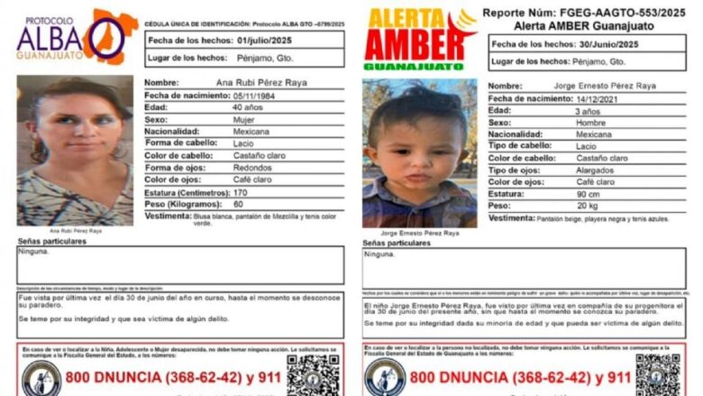 Pénjamo, Guanajuato.- La Fiscalía de Guanajuato activó una Alerta Amber y un Protocolo Alba por la desaparición en Pénjamo del menor Jorge Ernesto Pérez Raya, de tres años, y su madre, Ana Rubí Pérez Raya, de 40 años.