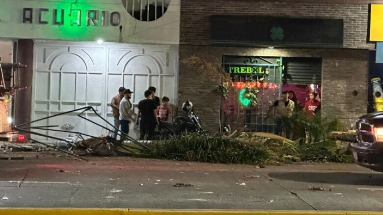 A pesar del impacto, el vehículo avanzó varios metros más hasta volcar frente a una taquería, donde quedó destrozado, dejando piezas de la carrocería esparcidas en el camino.