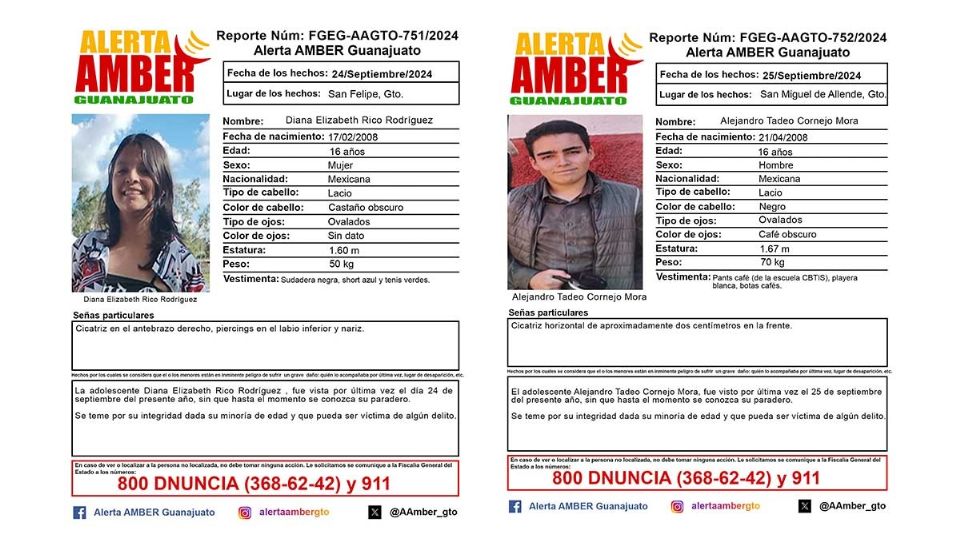 Guanajuato.- Familiares de Diana Elizabeth Rico Rodríguez y Alejandro Tadeo Cornejo Mora reportaron la desaparición de los dos menores de edad.