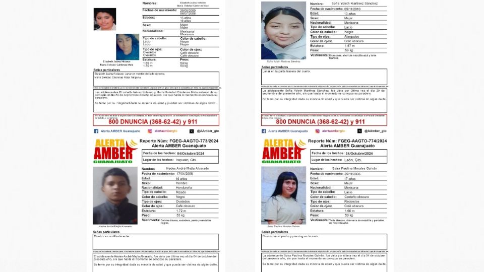 Guanajuato.- Elizabeth Juárez Nolasco, María Soledad Cárdenas Mata, Sofía Yoleth Martínez Sánchez, Hades André Mejía Alvarado y Saira Paulina Morales Galván desaparecieron en el estado en los últimos días.