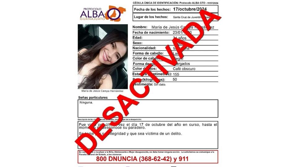 La última vez que se tuvo contacto con María fue el mes pasado en el municipio de Juventino Rosas. Ante la falta de comunicación con su familia, se activó de inmediato el Protocolo Alba para iniciar una búsqueda exhaustiva. Desafortunadamente, la alerta fue desactivada este jueves.