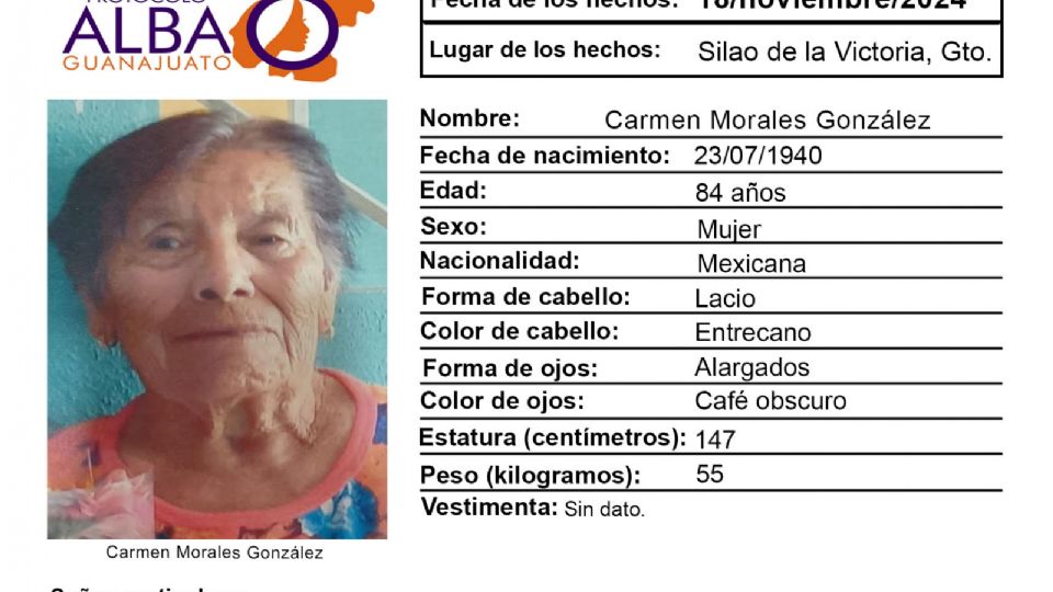 Silao, Guanajuato.- Carmen Morales González, de 84 años, salió de su domicilio este lunes 18 de noviembre y no ha vuelto.