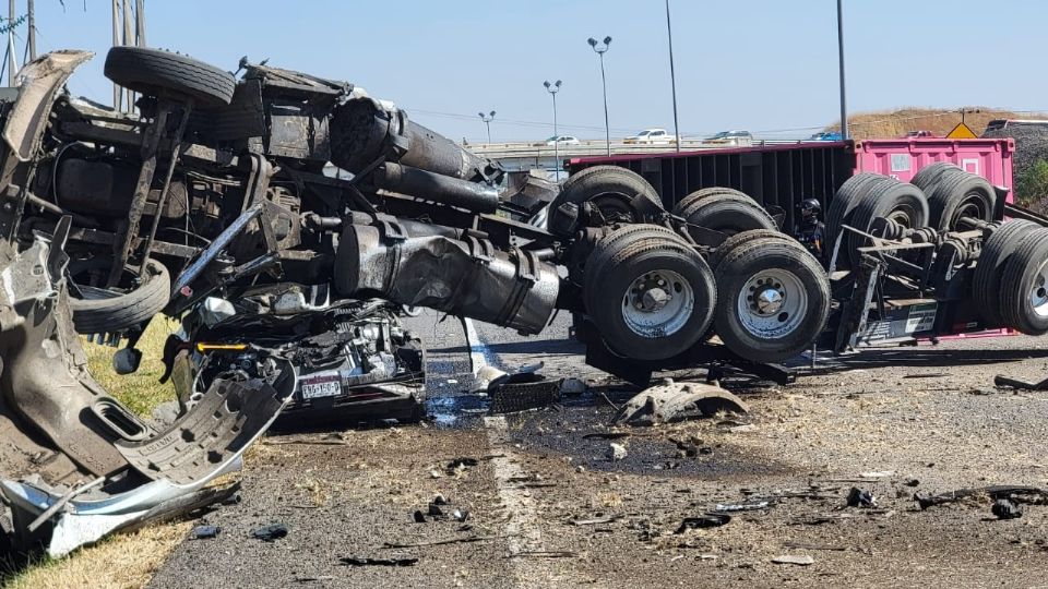 Un tráiler que circulaba de La Piedad hacia Pénjamo y que traía consigo una caja marítima, chocó contra la base de un espectacular y posteriormente brincó la cuneta central, lo que provocó que se elevara y terminara volcado sobre una camioneta que circulaba en el sentido contrario.