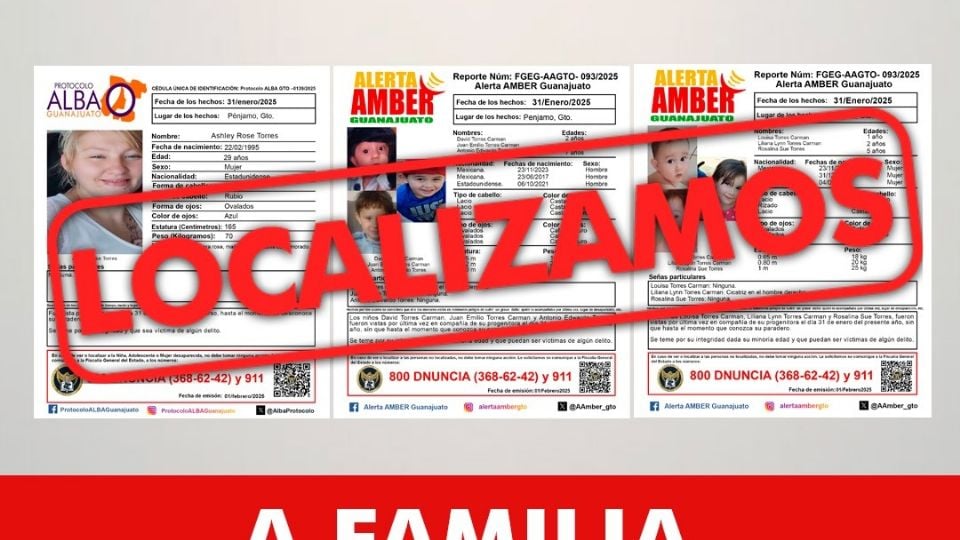 Este jueves, mediante un comunicado, sin grandes detalles, la Fiscalía del Estado informó sobre la localización de Ashley Rose Torres, de 29 años, y sus seis hijos habían sido reportados como desaparecidos el día 31 de enero.