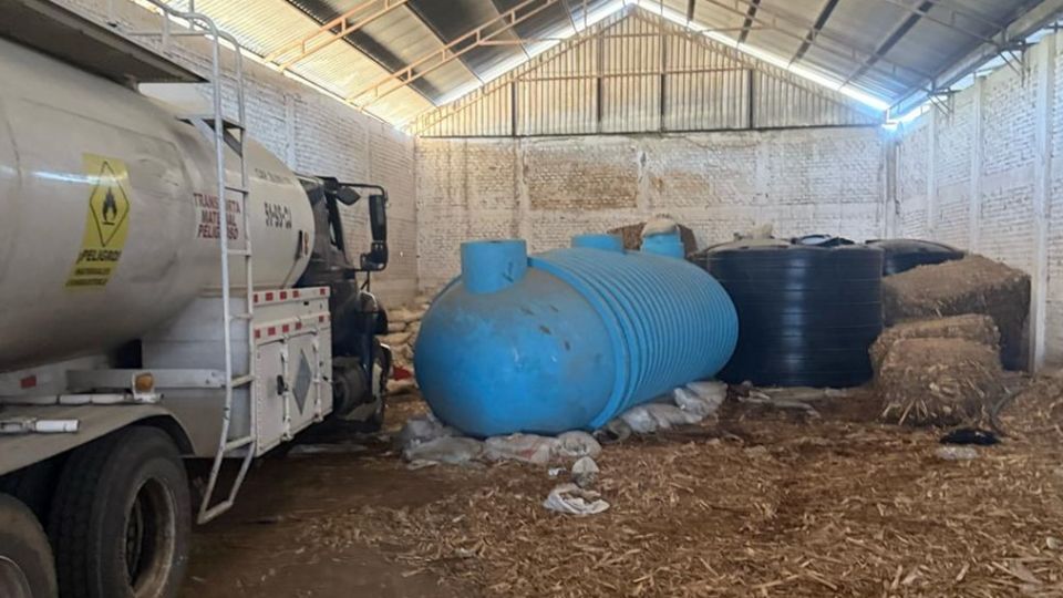 Durante el cateo, se aseguraron cinco contenedores con un total de 53 mil litros de hidrocarburo, un contenedor tipo oruga, un tractocamión tipo pipa y un tanque metálico de almacenamiento.