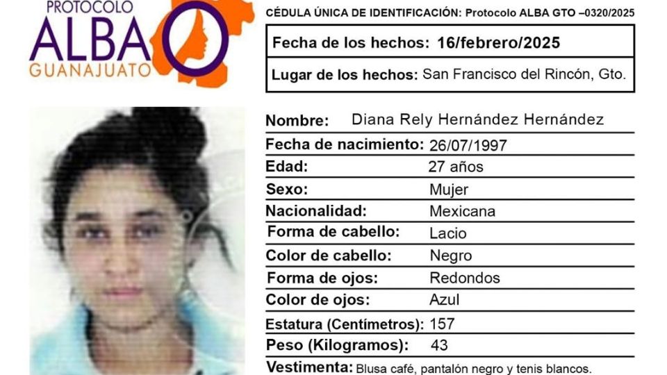 San Francisco del Rincón, Guanajuato.- Se activó el Protocolo Alba por la no localización de la joven Diana Rely Hernández Hernández, a quien buscan sus familiares desde febrero.