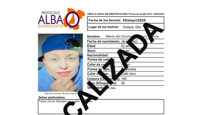 Celaya, Guanajuato.- El Protocolo Alba de María del Carmen Montero García fue desactivada, la joven mujer fue localizada sin vida en Juventino Rosas.