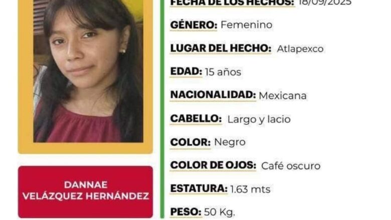 La menor responde al nombre de Dannae Velázquez Hernández. Como señas particulares se informó que tiene cabello largo y lacio, color negro; ojos café oscuro; mide 1.63 metros de estatura y pesa aproximadamente 50 kilogramos.