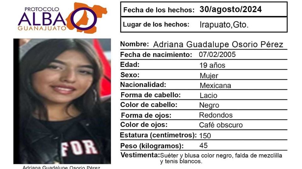 De acuerdo con la ficha de búsqueda, Adriana Guadalupe desapareció el 30 de agosto, en Irapuato.
