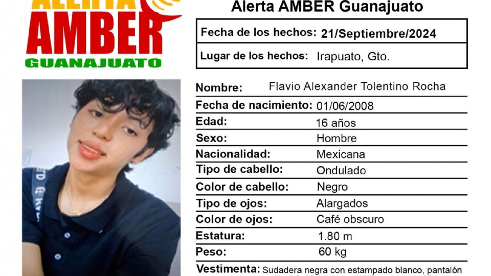 En el reporte FGEG-AAGTO-744/2024 se lee que Flavio Alexander es de cabello ondulado y negro, ojos alargados y cafés obscuros; mide 1.80 metros y pesa 60 kilos. Como seña particular, lunares en la frente y marcas de acné en el rostro.