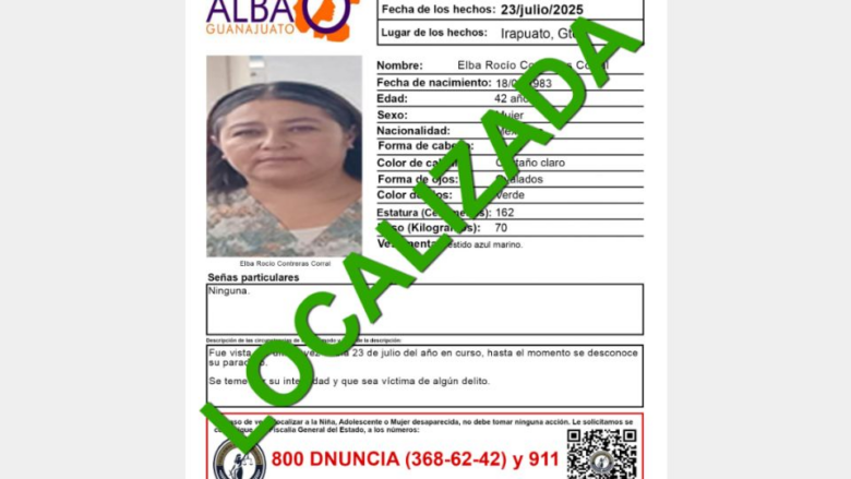 Irapuato, Guanajuato.- La Fiscalía General del Estado activó el Protocolo Alba Guanajuato para localizar a Elba Rocío Contreras Corral, de 42 años.