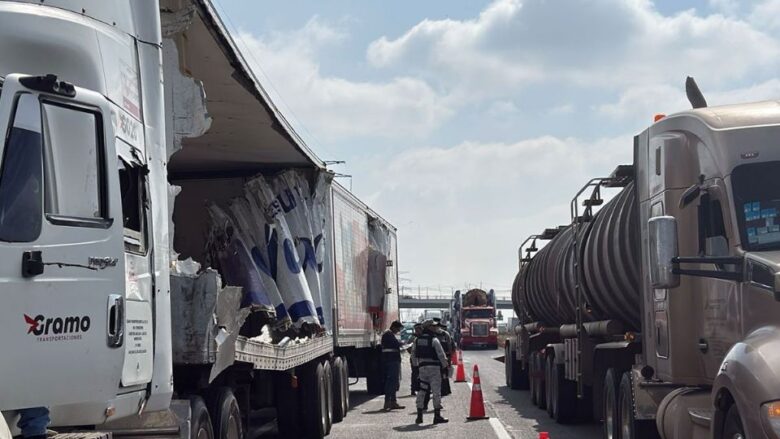 De acuerdo con los primeros reportes, el percance ocurrió antes de ingresar a una desviación cuando un tráiler chocó contra otro en circulación y provocó que parte de la caja se desprendiera.