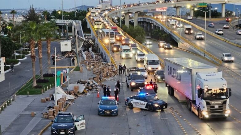 León, Guanajuato.- El conductor de un tráiler resultó ileso tras perder el control del volante y caer del distribuidor vial Juan Pablo II. Aún se desconoce si bajaba el puente a exceso de velocidad antes de llegar a una curva.