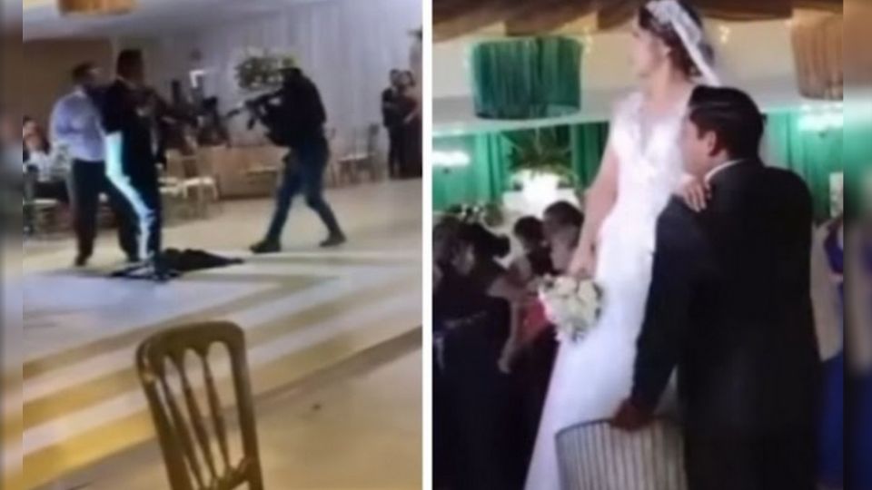 Como la víctima trata de zafarse, lo despojan del saco y después es jaloneado de la corbata, justo detrás de donde se encontraba la novia subida en una silla con el ramo en la mano y su novio la auxiliaba. La pareja observaba asombrada lo que sucedía en el salón y otros invitados se replegaban.