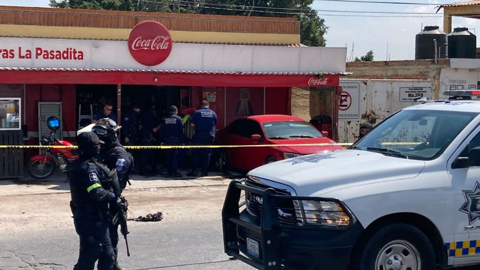 Policías municipales acudieron de inmediato a la tienda ‘La Pasadita’, encontraron a una mujer herida y a un hombre muerto, a un costado de un auto tipo sedán rojo.