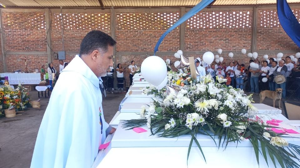 Los féretros de color blanco fueron colocados frente al altar que se instaló en el salón donde se congregaron centenares de personas, durante la misa el pastor de la iglesia católica gritó el nombre de los jóvenes asesinados, amigos y familiares respondieron “VIVEN”.