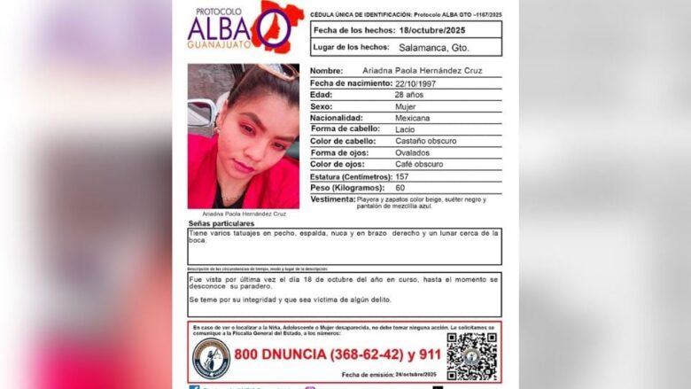 Ariadna Paola Hernández Cruz tiene 28 años y desde el 18 de octubre es reportada como desaparecida; si tienes información sobre su paradero, comunícate al 911. Foto: Cortesía Protocolo Alba Guanajuato.
