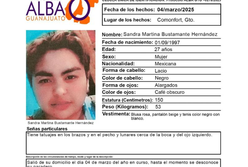 Publicado enguanajuato Desaparece otra joven en Guanajuato: Buscan a Sandra Martina Bustamante Hernández en Comonfort por Redacción AM6 marzo, 2025