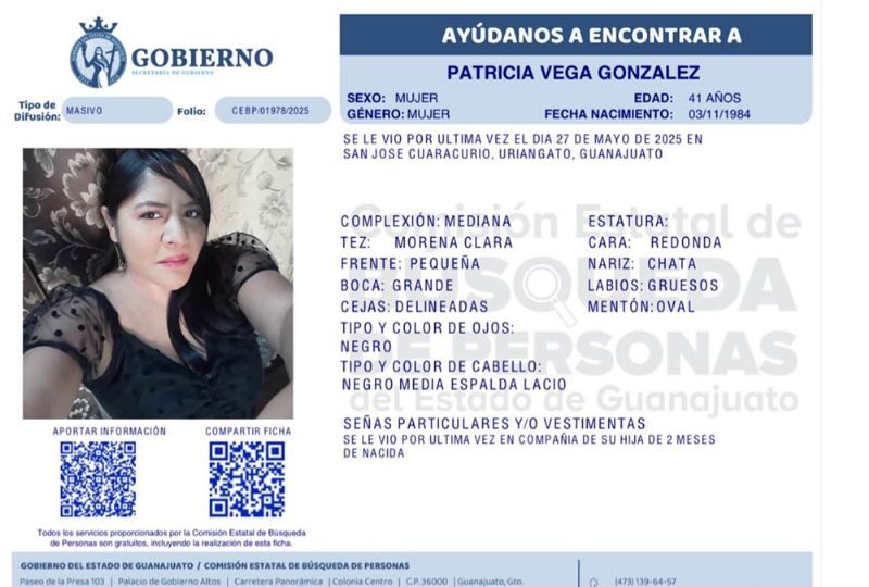 Publicado enguanajuato-sur Patricia Vega González salió de su casa con su hija de 2 meses y desde hace 11 días no las localizan por Redacción AM6 junio, 2025