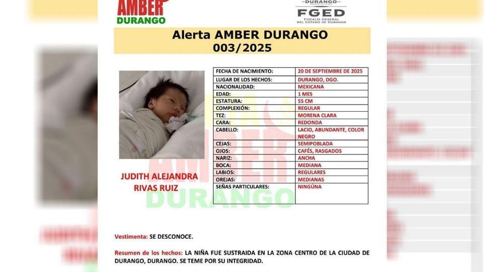 Alerta: Roban a bebé de un mes del Hospital Materno Infantil de Durango y activan Alerta Amber