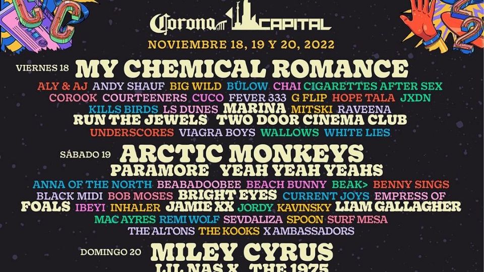 Publicado enespectaculos Corona Capital: My Chemical Romance, Miley Cyrus, Arctic Monkeys y Yeah Yeah Yeahs son parte del cartel por Juanita Crespo Arrona9 junio, 2022