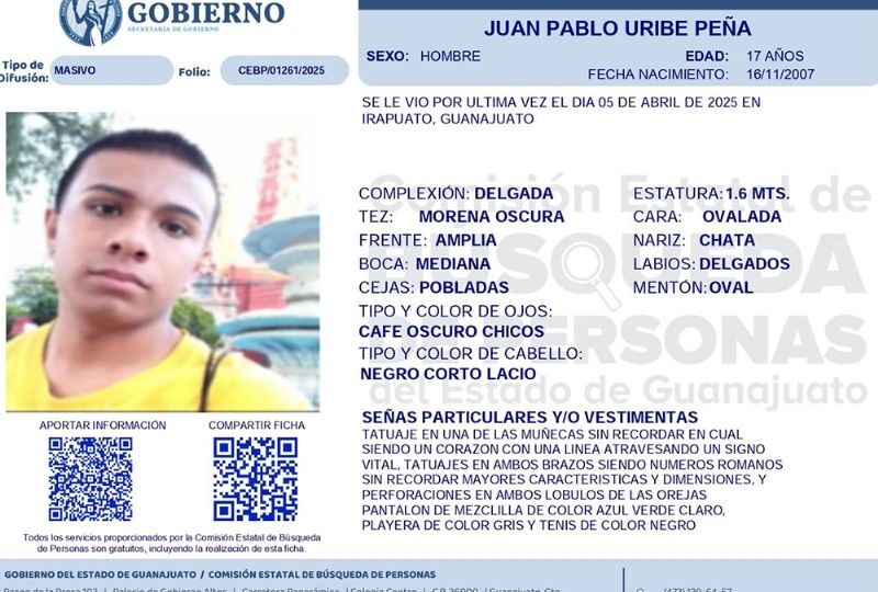 Publicado enirapuato Urge localizar a Juan Pablo Uribe Peña, desapareció el 5 de abril en Irapuato por Redacción AM10 abril, 2025