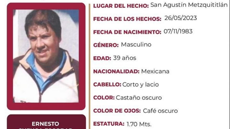 Publicado enhidalgo Ayuda a encontrar a Ernesto Cuenca Escobar, desapareció en San Agustín Metzquititlán por Redacción31 mayo, 2023