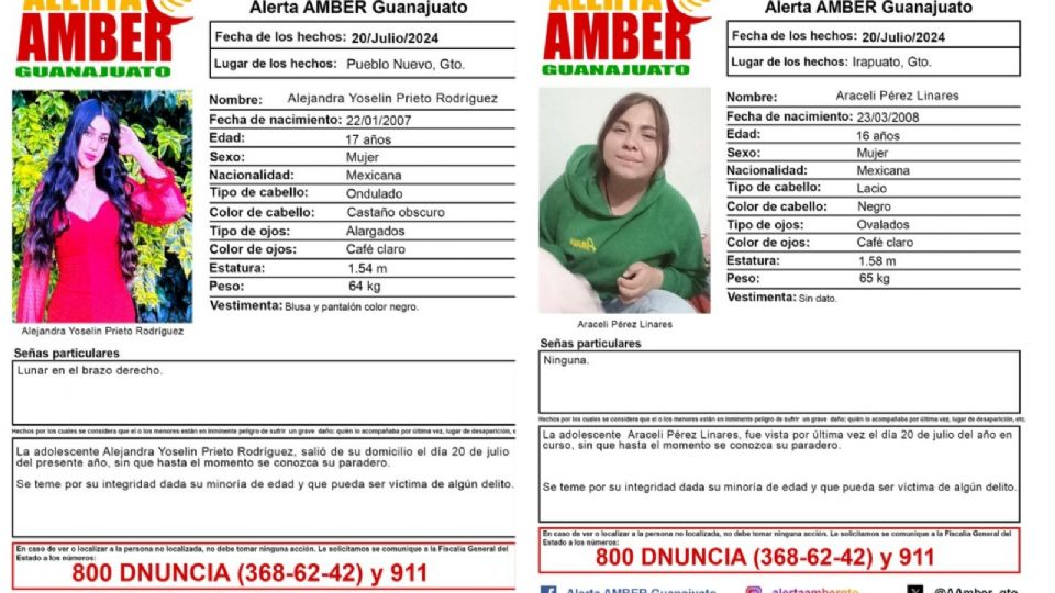 Publicado enirapuato Activan Alerta Amber: Alejandra Yoselin Prieto Rodríguez y Araceli Pérez Linares desaparecieron el mismo día, en diferente ciudad por Redacción AM22 julio, 2024