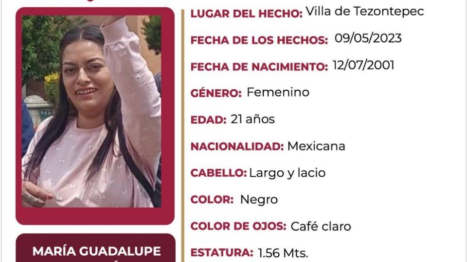 Publicado enzona-metropolitana Buscan a María Guadalupe Elizalde Ávila, desapareció en Villa de Tezontepec por Hidalgo Redacción10 mayo, 2023
