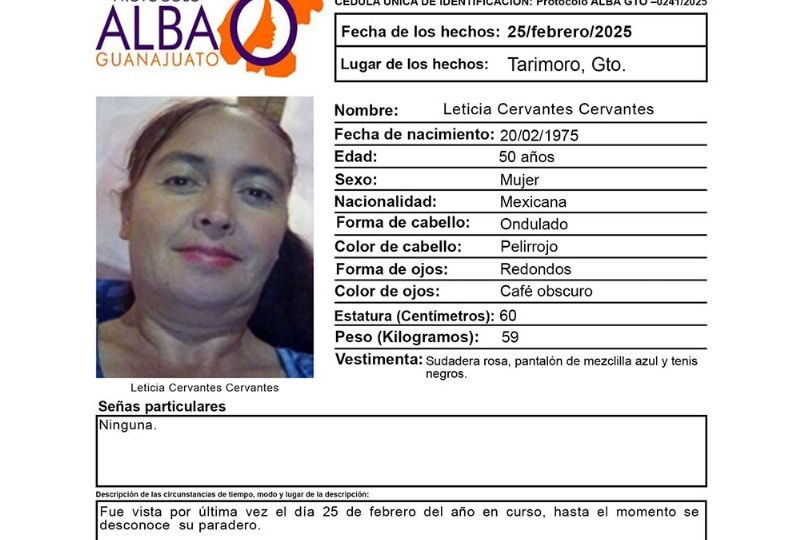 Publicado enguanajuato-sur Peligra Leticia Cervantes Cervantes, desapareció el 25 de febrero en Tarimoro y activan Protocolo Alba por Redacción AM27 febrero, 2025
