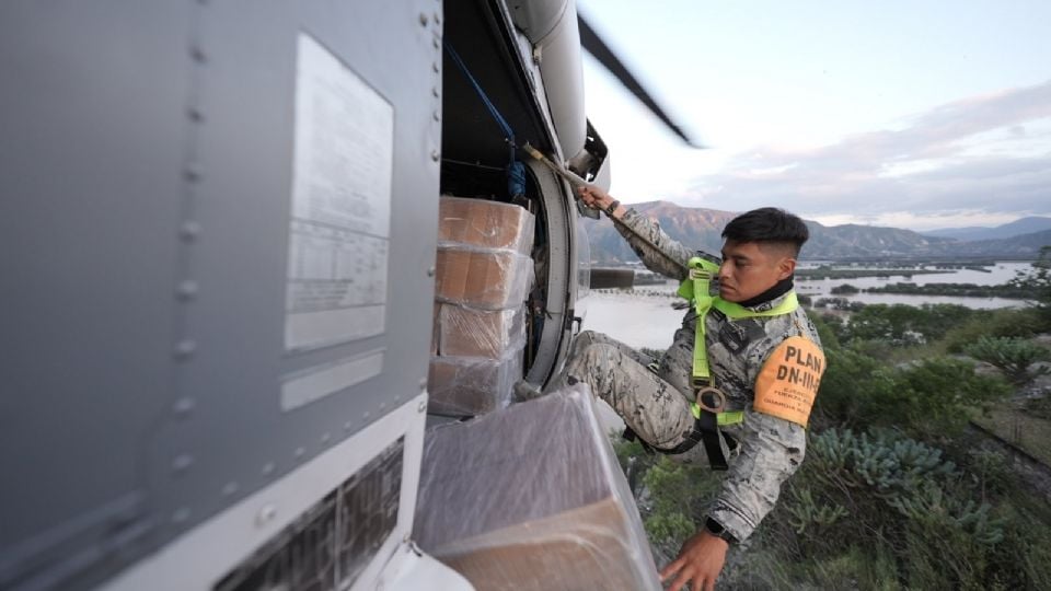 En la Vega de Metztitlán, oficiales realizan maniobras aéreas para entregar ayuda humanitaria en zonas sin acceso terrestre ni puntos de aterrizaje.