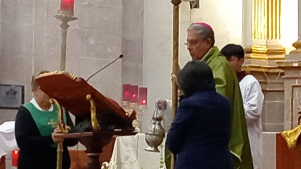 Fue durante la eucaristía de las 11:00 horas, dedicada a la familia, en la que monseñor hizo un ritual especial en el que se colocó la biblia bellamente adornada entre cubiertas laminadas doradas en un pedestal especial.