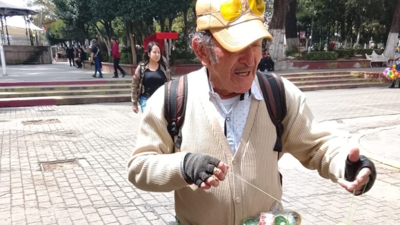 La vuelta al mundo, el trapecista, el elevador, tejiendo un suéter, la cueva del oso, el columpio chino y el normal, el cuete, son entre otros muchos los nombres de los trucos que se hacen con un yoyo y que Sabas Jaime de la Rosa Luqueño, de 69 años, originario de Tulancingo, hace y enseña a realizarlos en calles de su pueblo natal.
