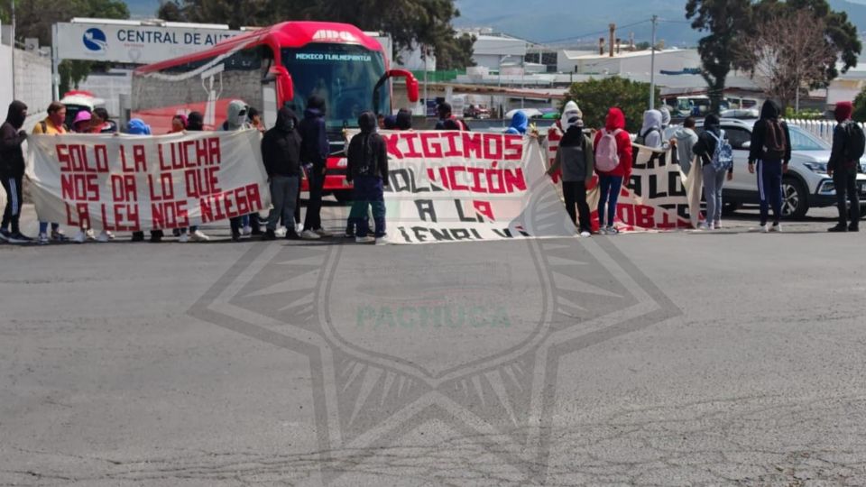 Integrantes de la escuela Normal Luis Villareal, El Mexe, bloquean el acceso a la Central de Autobuses de Pachuca.