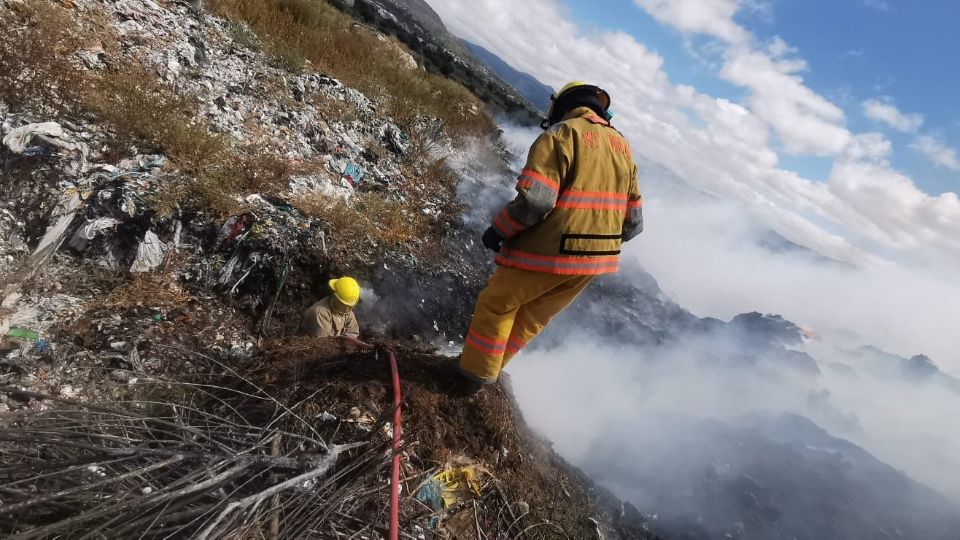 Rescatistas de Protección Civil de Mineral de la Reforma laboran para controlar un incendio en el basurero ubicado en El Amaque, en dicho municipio.