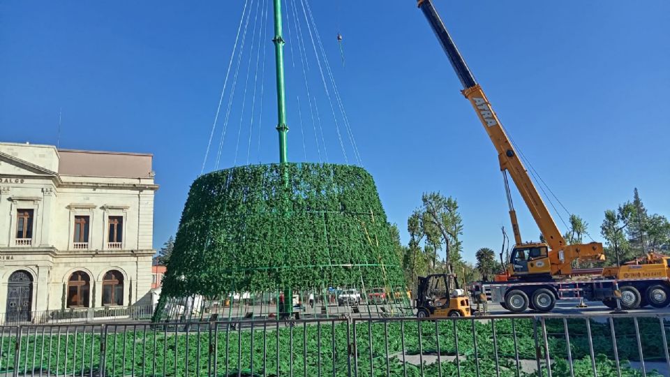 Cuando faltan tres semanas para que inicie diciembre, en la Plaza Juárez de Pachuca ya se está instalando el árbol navideño.